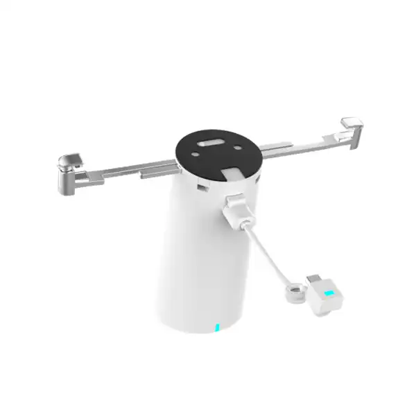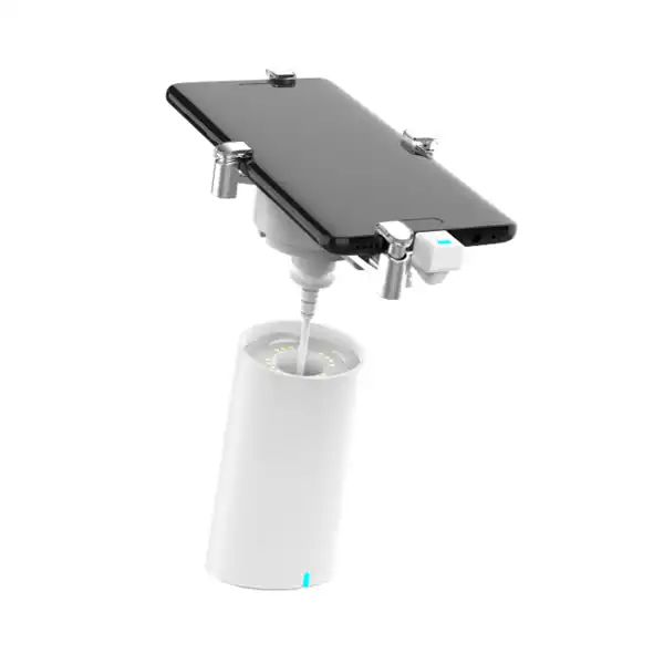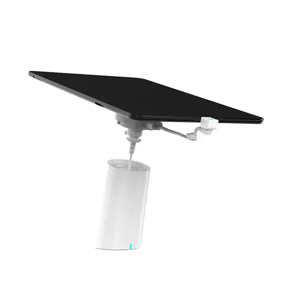 The DE50MSA series features a 360-degree swivel and an integrated built-in recoiler with steel cable for a clean, organized display of phones and tablets. Its modular design facilitates easy swapping of claws and cables to fit various shapes and security needs. For enhanced theft prevention, built-in screws can be locked to fasten the device in place securely.